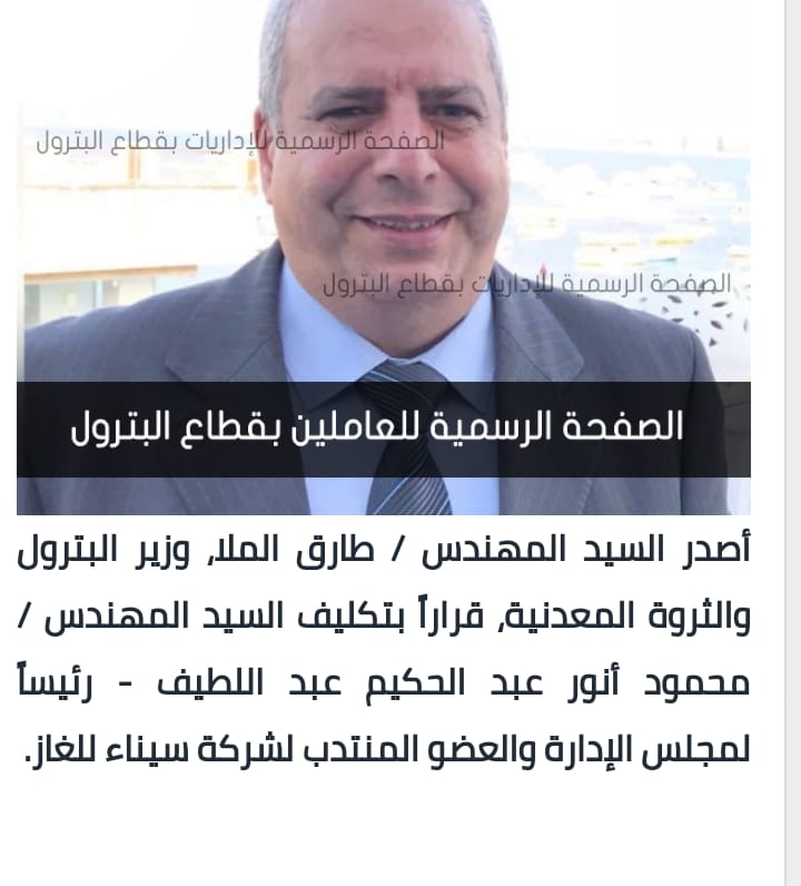 أصدر المهندس طارق الملا وزير البترول والثروة المعدنية، قراراً بتكليف المهندس محمود أنور عبد الحكيم عبد اللطيف رئيساً لمجلس الإدارة والعضو المنتدب لشركة سيناء للغاز .