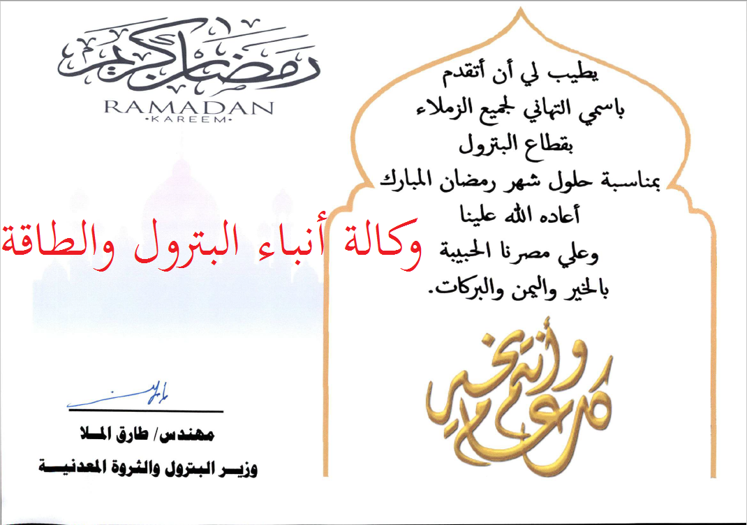 تقدم المهندس طارق الملا وزير البترول والثروة المعدنية بخالص التهنئة إلى العاملين بقطاع البترول بمناسبة حلول شهر رمضان المبارك