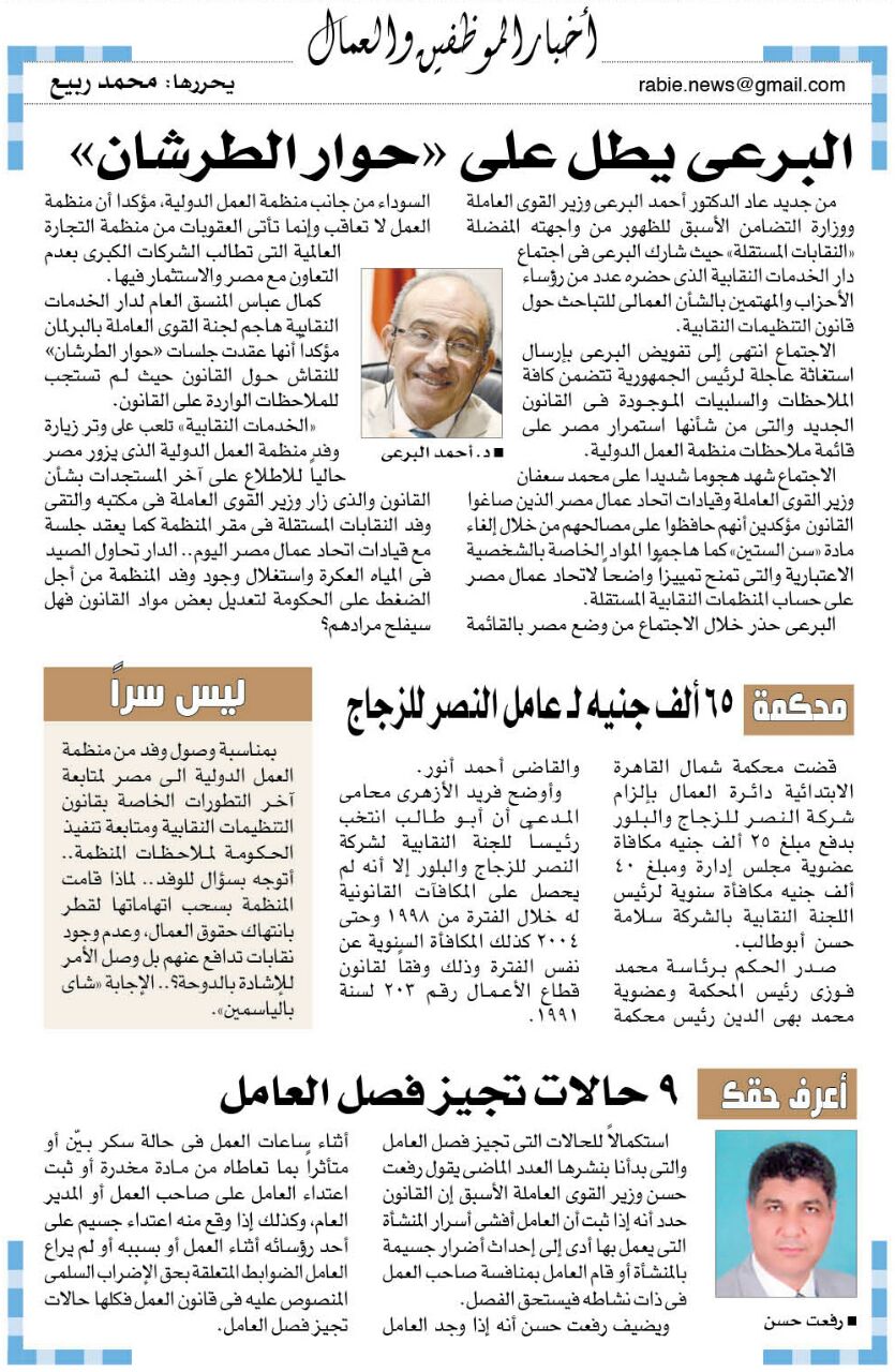 “الخدمات النقابية” تحاول استغلال وفد منظمة العمل الدولية الذي يزور مصر حالياً للإطلاع على أخر المستجدات بشأن القانون خاصة أن الوفد زار وزير القوى العاملة في مكتبه والتقي وفد النقابات المستقلة في مقر المنظمة كما يعقد جلسة مع قيادات اتحاد عمال مصر اليوم ..الدار تحاول الصيد في المياة العكرة واستغلال وجود وفد المنظمة من أجل الضغط على الحكومة لتعديل بعض مواد القانون فهل سيفلح مرادهم؟.