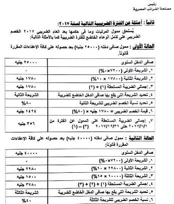 وجاء بالكتاب الدورى أن الشريحة المعفاة 7200 جنيه تخصم عن السنة بالكامل، وأن يطبق الخصم الضريبى على المرتبات من تاريخ صدوره، ويتم حساب الخصم بعد الوصول لصافى الإيراد، وفقًا للقواعد القانونية المطبقة بما فى ذلك الإعفاء الشخصى – 7000 جنيه سنويا للموظفين، ويتم حساب إجمالى الضريبة المستحقة ثم يتم تحديد الشريحة، التى يتم حساب الخصم على أساسها وبعد ذلك تحدد الضريبة الواجبة السداد بالفارق بين إجمالى الضريبة وقيمة الخصم .