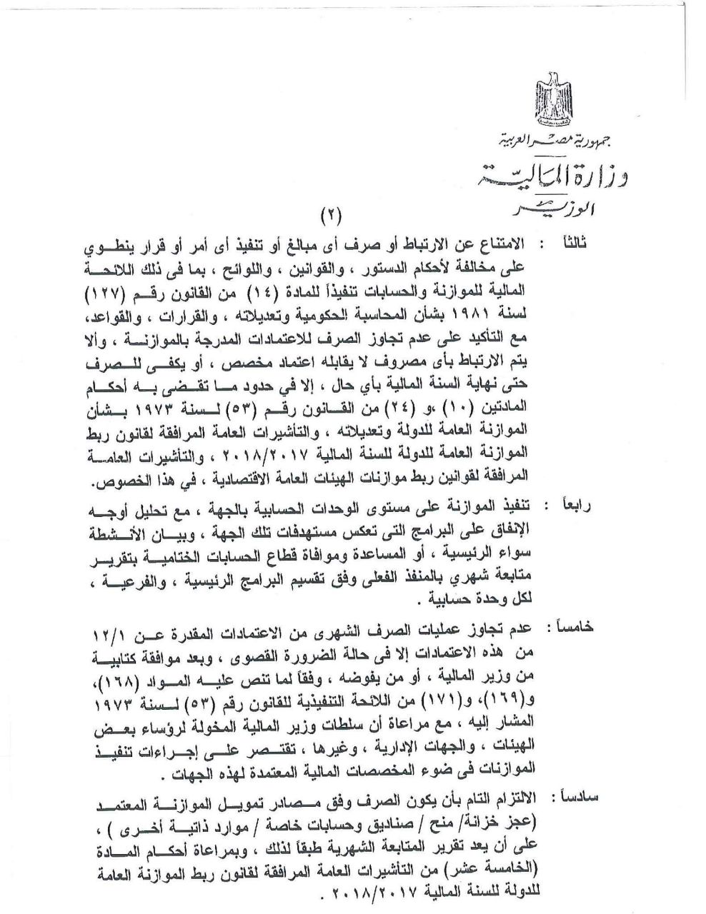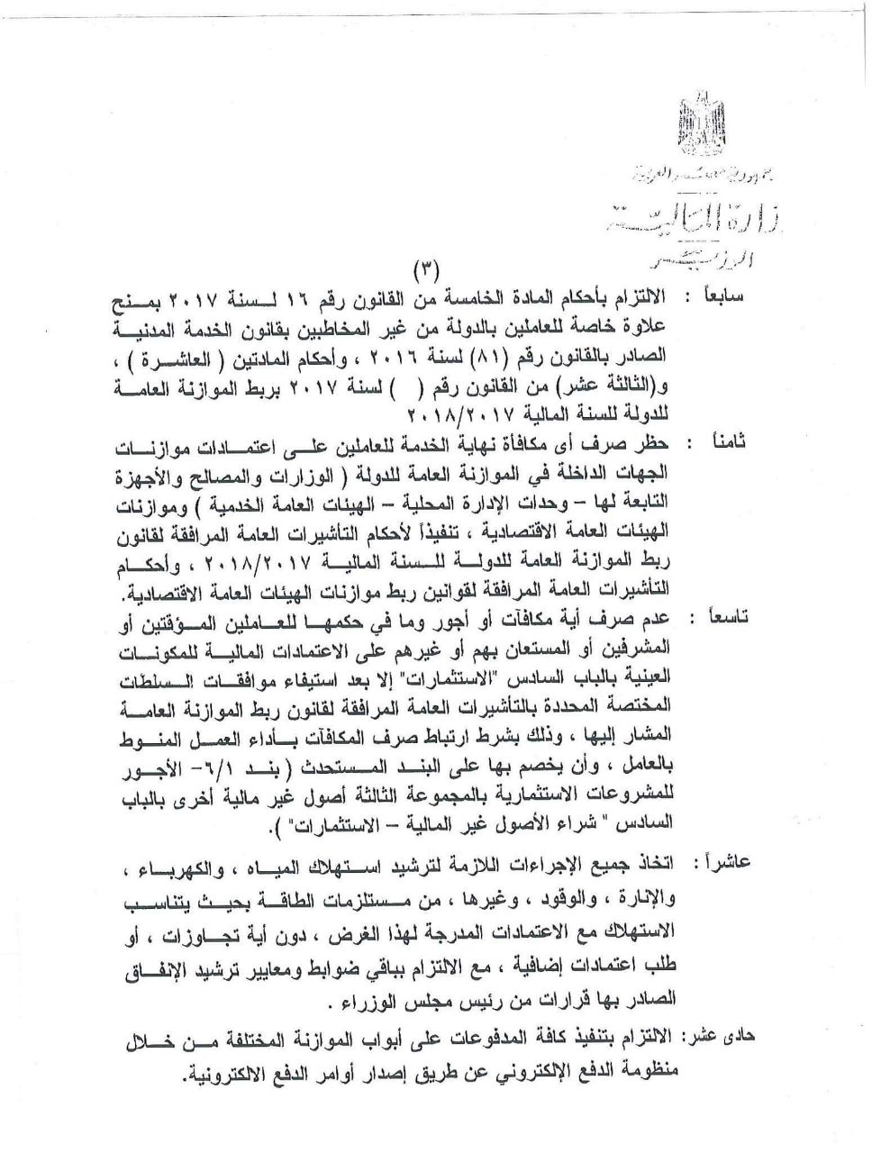 ثامنا:حظر صرف أى مكافأة نهاية الخدمة للعاملين على اعتمادات موازنات الجهات الداخلة فى الموازنة العامة للدولة (الوزارات والمصالح والأجهزة التابعة لها –وحدات الإدارة المحلية – الهيئات العامة الخدمية) وموازنات الهيئات العامة والاقتصادية ، تنفيذا لأحكام التأشيرات العامة الموافقة لقانون ربط الموازنة العامة للدولة للسنه المالية 2017/2018، وأحكام التأشيرات العامة المرافقة لقوانين ربط موازنات الهيئات العامة الاقتصادية .