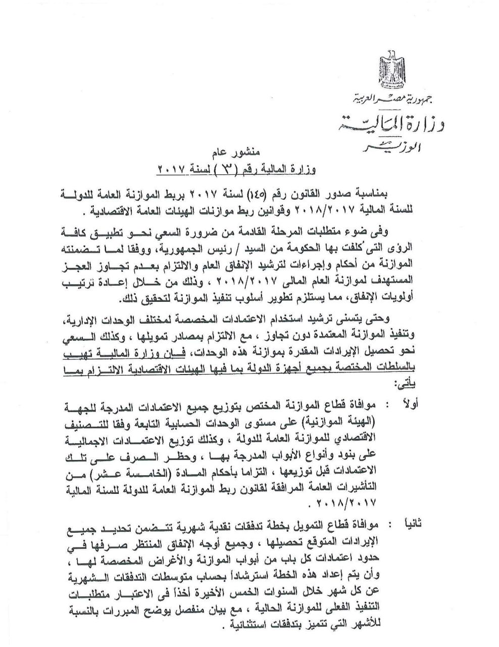 تضمن نص منشور عام صادر عن وزارة المالية بمناسبة صدور القانون رقم 145-2017 بربط الموازنة العامة للدولة للسنة المالية 2017\2018 وقوانين ربط موازنات الهيئات العامة فى 27 يوليو 2017، على مادتين تختص بصرف مكافأت نهاية الخدمة وصرف المكافأت والأجور للعاملين المؤقتين والمشرفين والمستعان بهم وإلى نص المادتين ومرفق نص المنشور الصادر عن وزارة المالية للجهات بتاريخ 27 يوليو 2017.