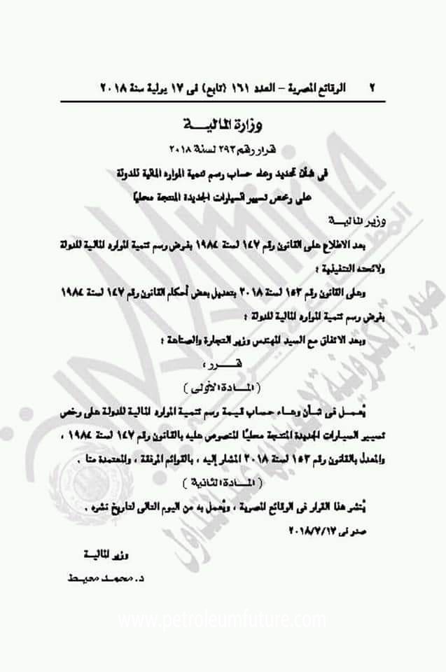أصدر د. محمد معيط، وزير المالية، قراره 293 لسنة 2018 بتحديد وعاء حساب رسم تنمية موارد الدولة على رخص تسيير السيارات الجديدة المنتجة محليا.