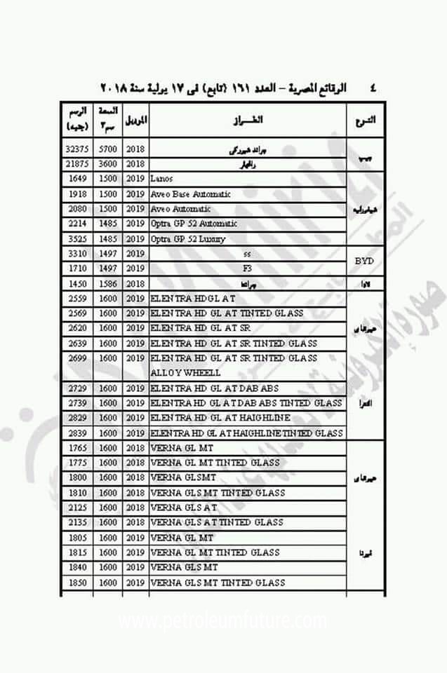 وتنوعت قيم الرسوم من سيارة لأخرى على حسب نوع وموديل السيارة والسعة اللترية لمحركها، فعلى سبيل المثل تراوحت قيمة الرسم للسيارات BMW موديل 2018 من 6 آلاف جنيه وحتى 71 ألف 250 جنيها، على حسب الفئة والسعة اللترية، وتراوحت قيمة الرسم بالنسبة للسيارات نيسان sunny وsentra موديل 2019 من 2150 جنيها إلى 2990 جنيها، فيما تراوحت القيمة بالنسبة لسيارات تويوتا فورتشنر 2019 من 24 ألف 123 جنيه إلى 27 ألف و500 جنيه.