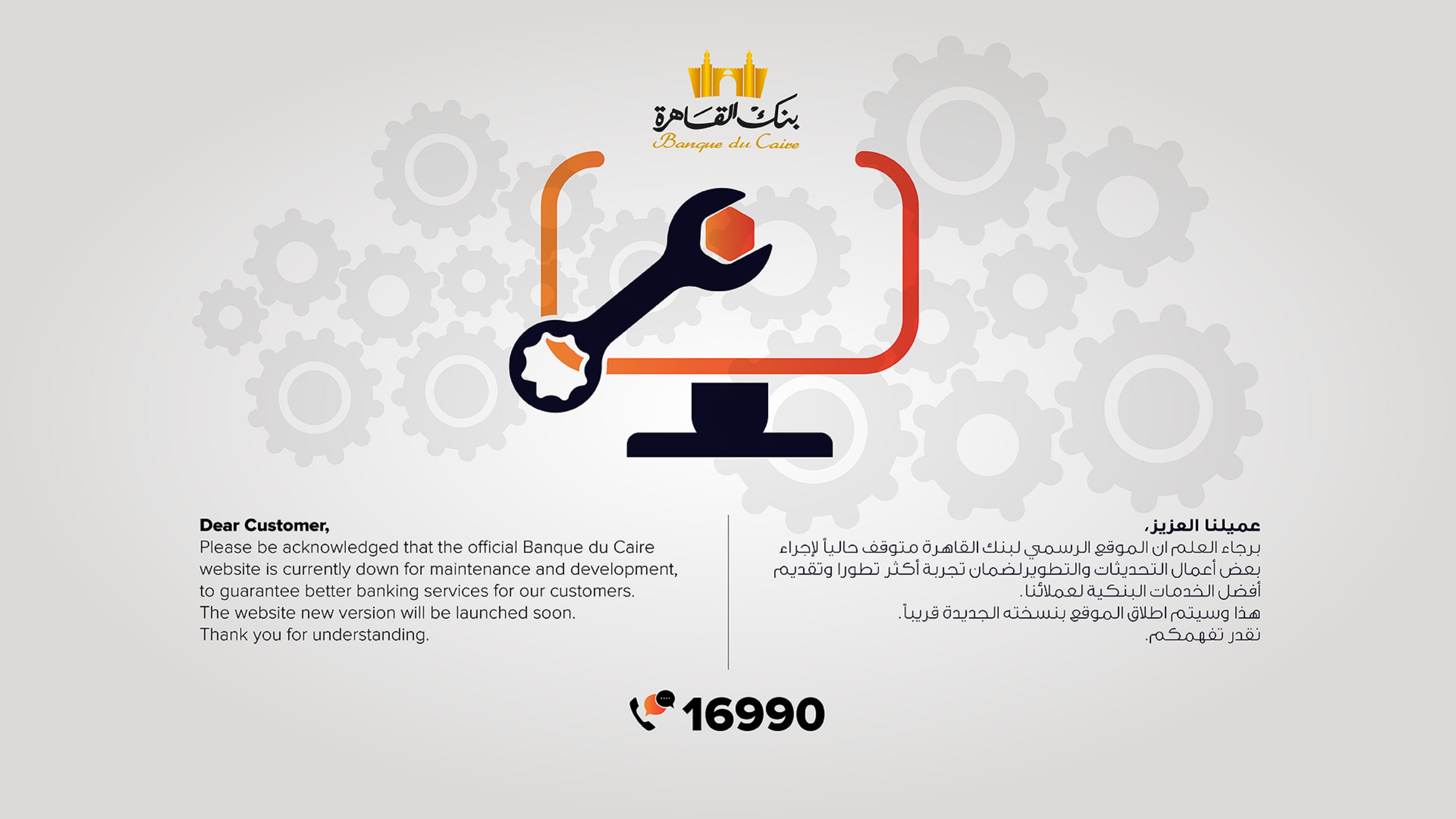 Dear Customer, Please be acknowledged that the official Banque du Caire website is currently down for maintenance and development, to guarantee better banking services for our customers. The website new version will be launched soon. Thank you for understanding.