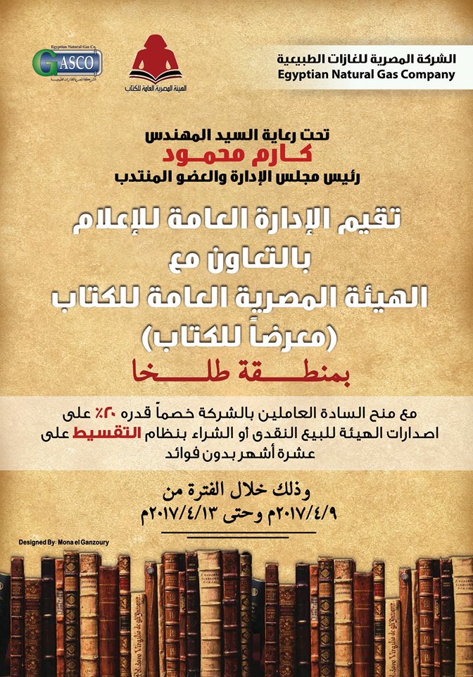 تقيم الإدارة العامة للإعلام بشركة جاسكو، بالتعاون مع الهيئة المصرية العامة للكتاب،معرضا للكتاب ، بمنطقة طلخة، وذلك تحت رعاية المهندس كارم محمود رئيس مجلس الإدارية والعضو المنتدب.