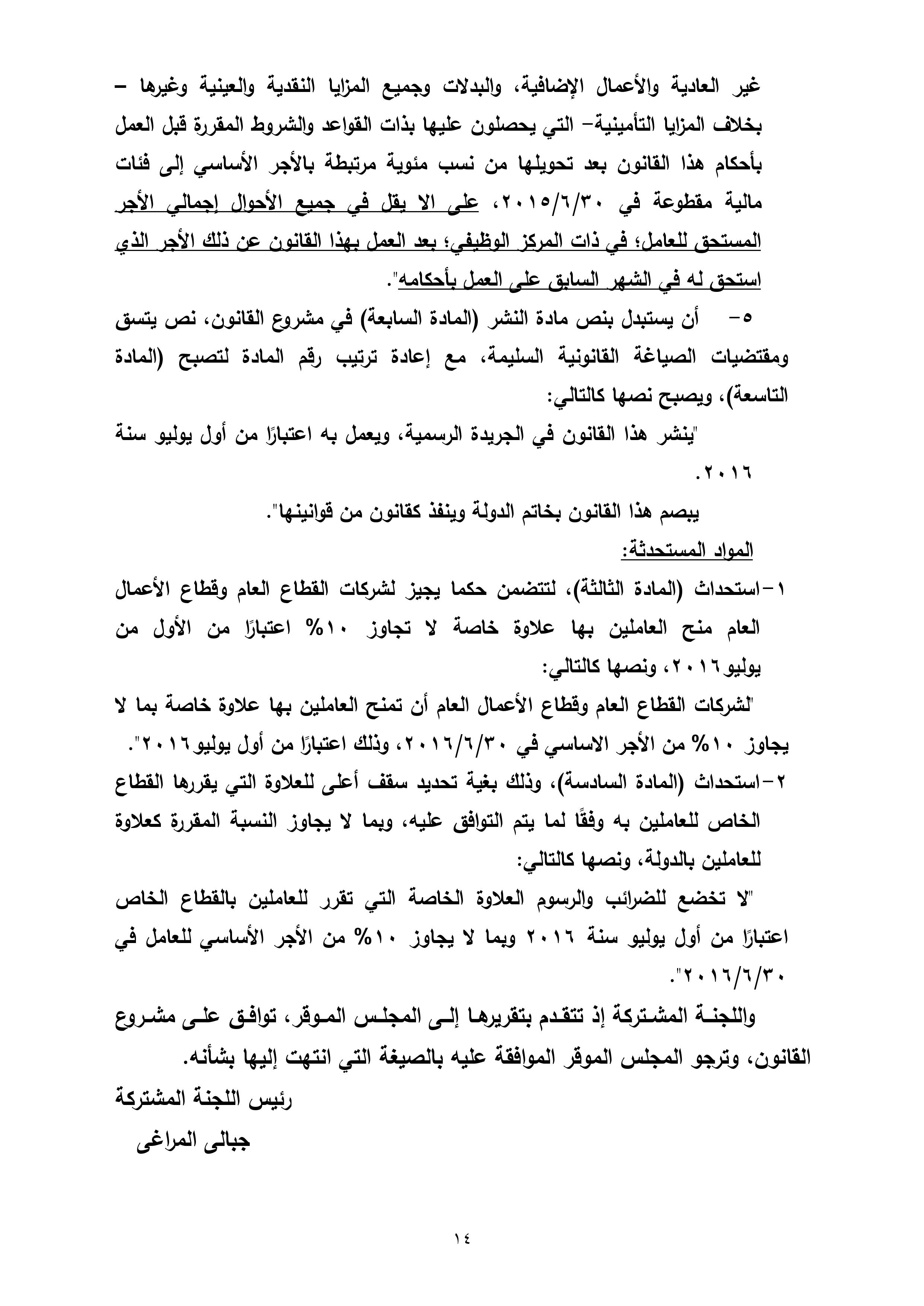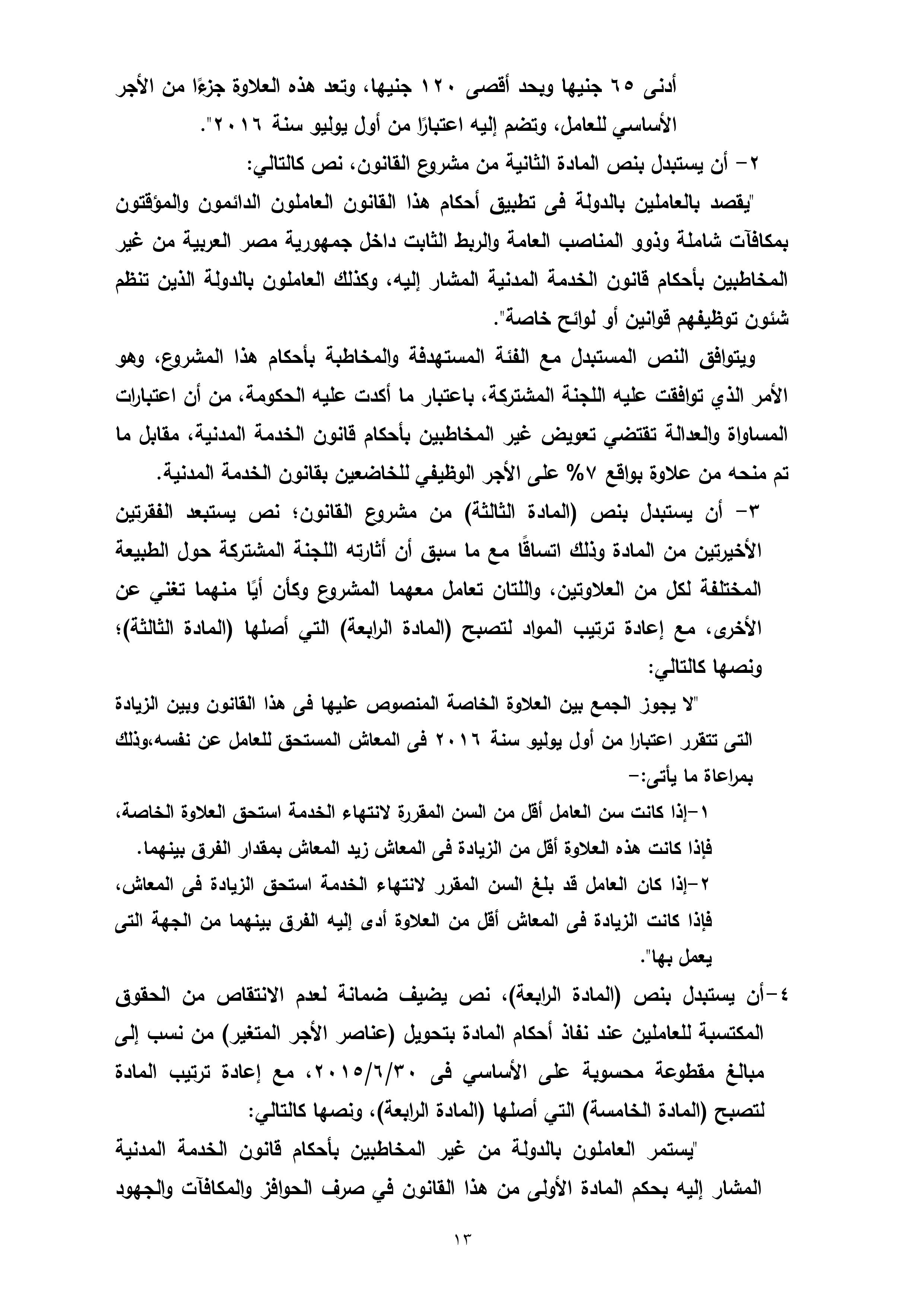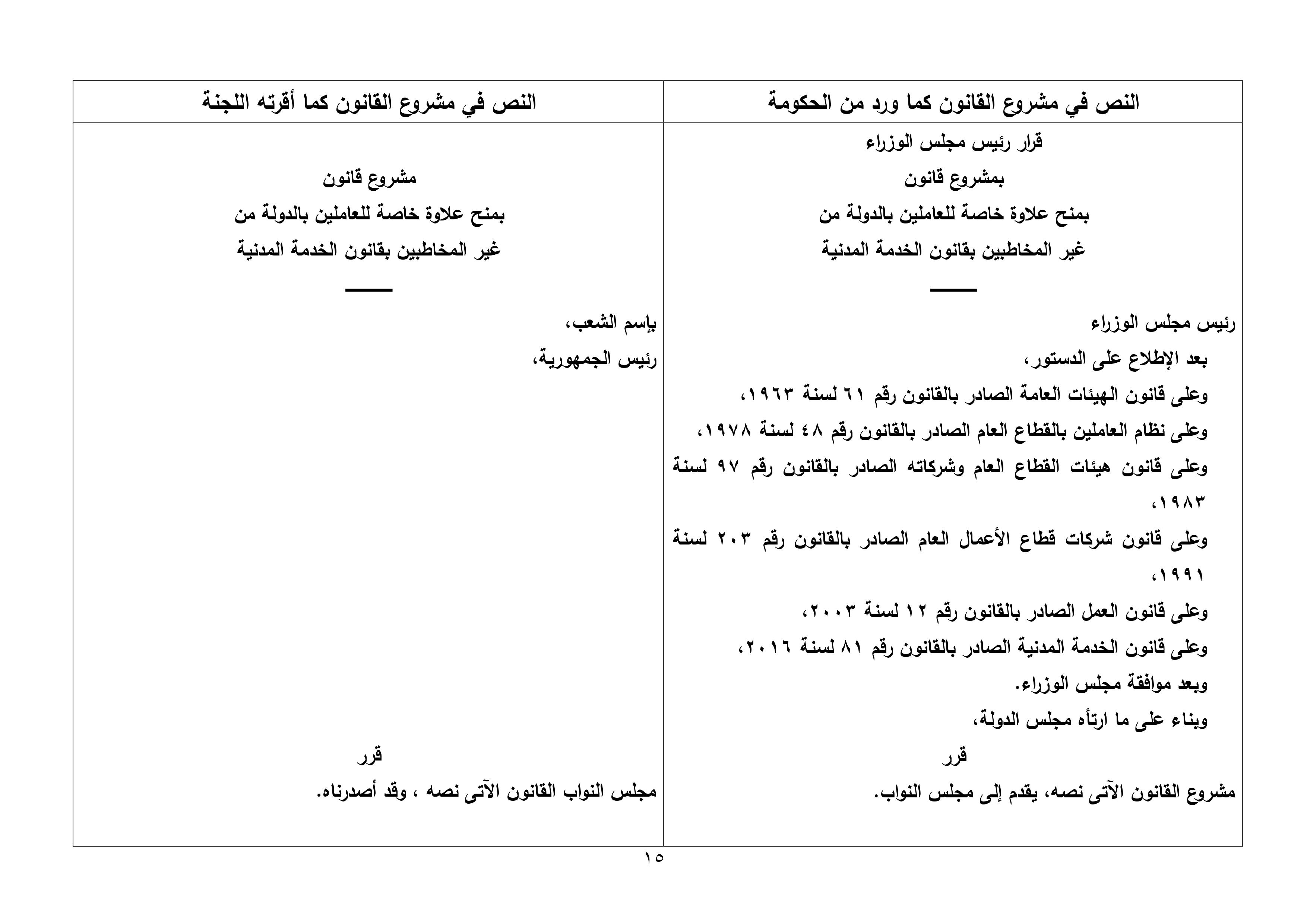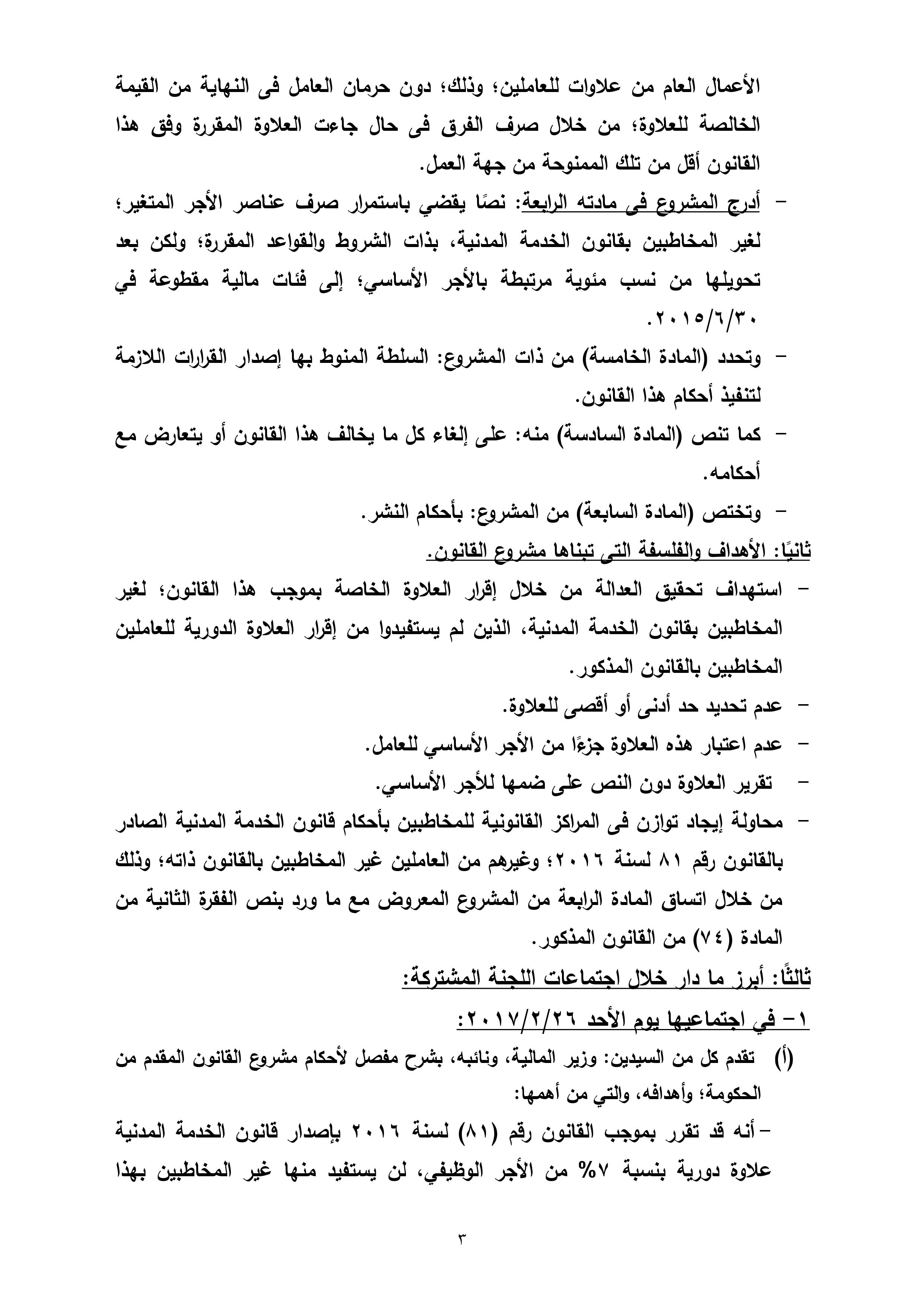 تنشر “وكالة أنباء البترول والطاقة”، نص تقرير لجنة القوى العاملة بمجلس النواب، بشأن مشروع قانون العلاوة الخاصة للعاملين بالدولة من غير المخاطبين بأحكام قانون الخدمة المدنية رقم 81 لسنة 2016، والذى سيعرض على الجلسة العامة لمجلس النواب الأسبوع الجارى لمناقشته وإقراره.