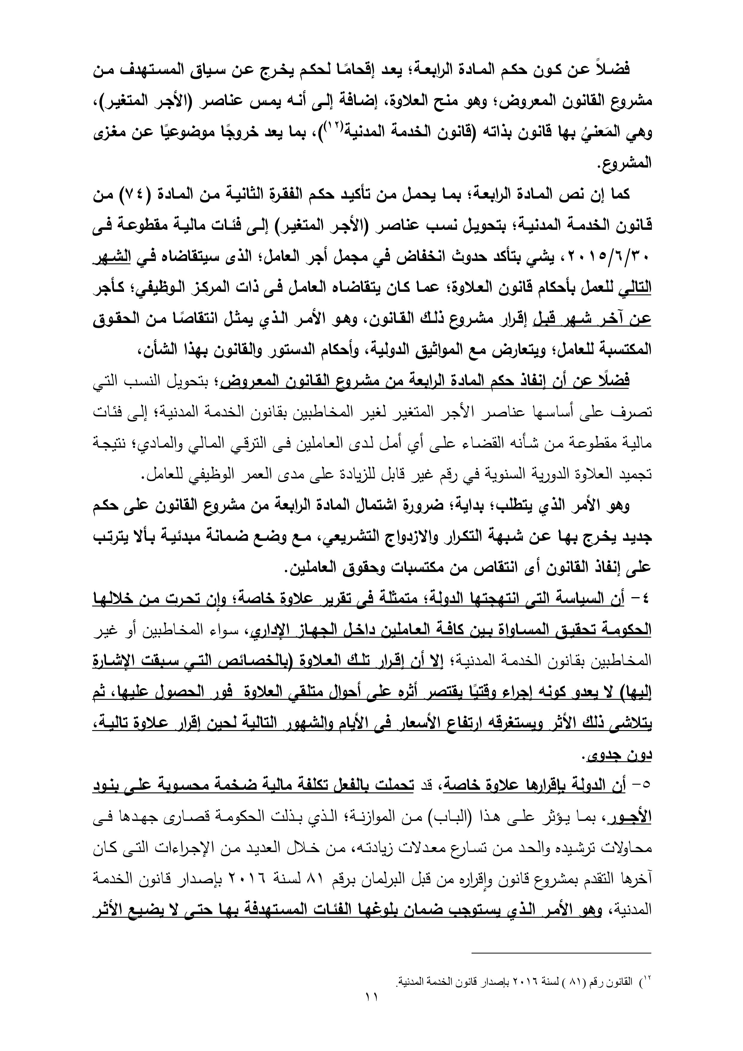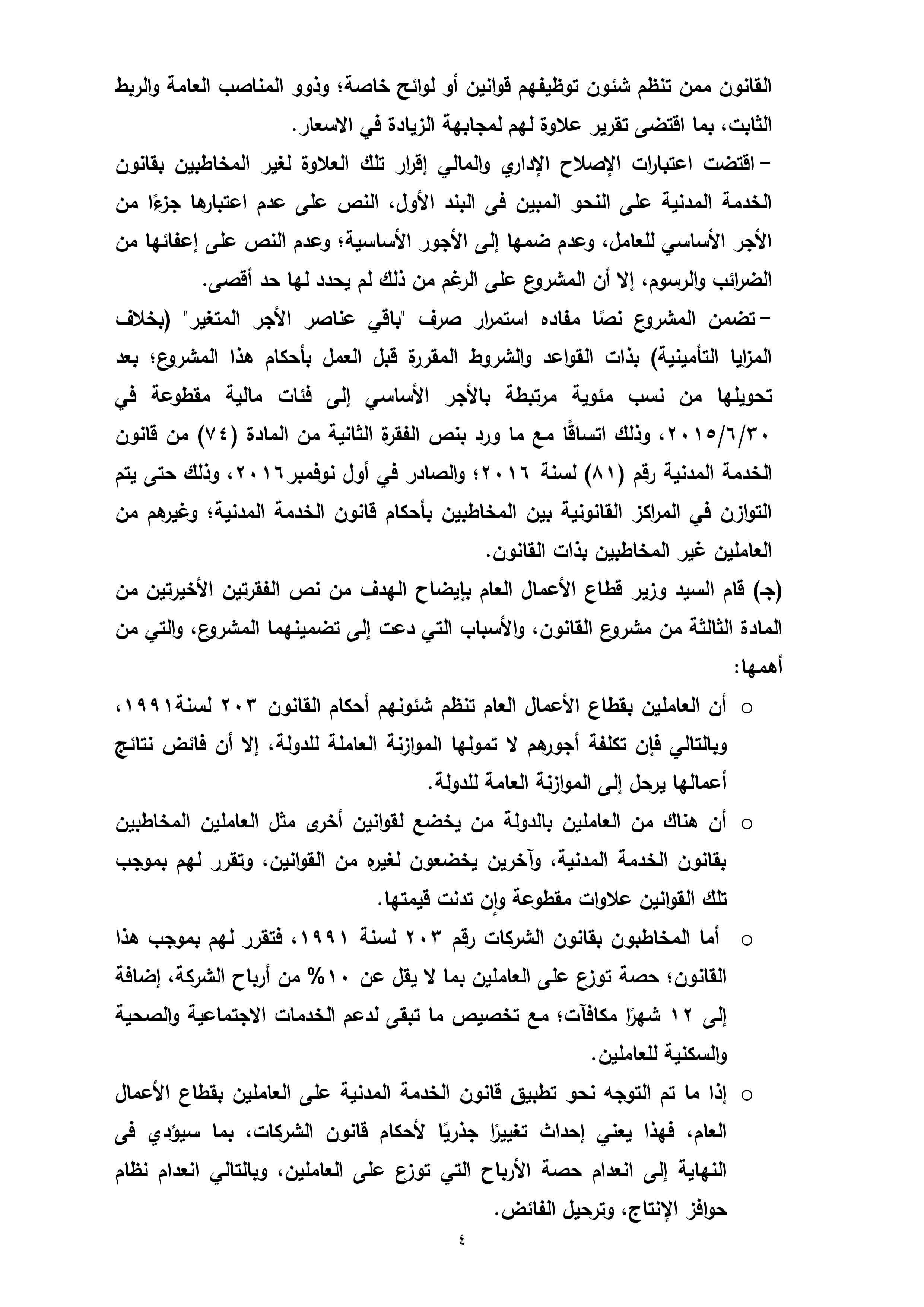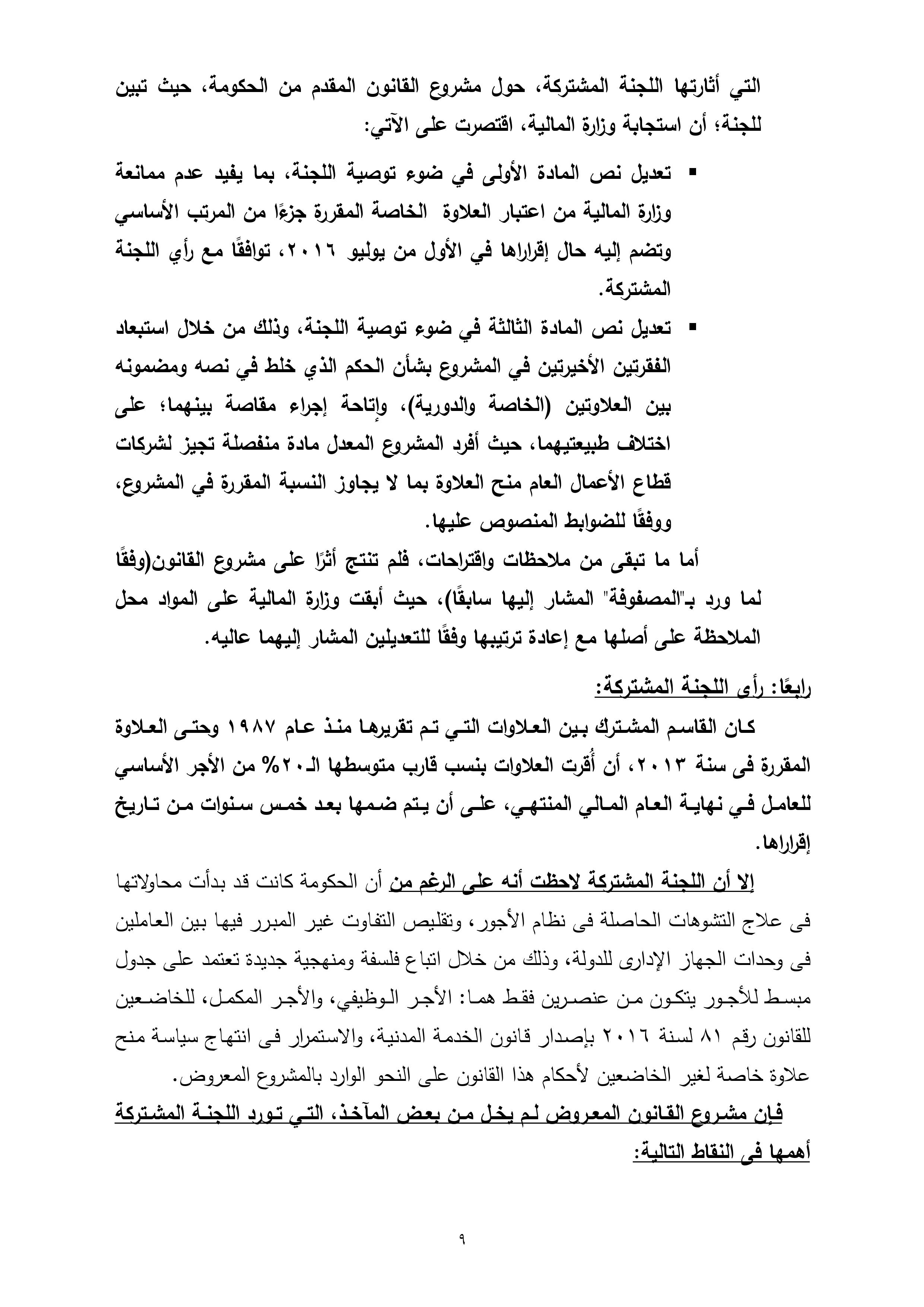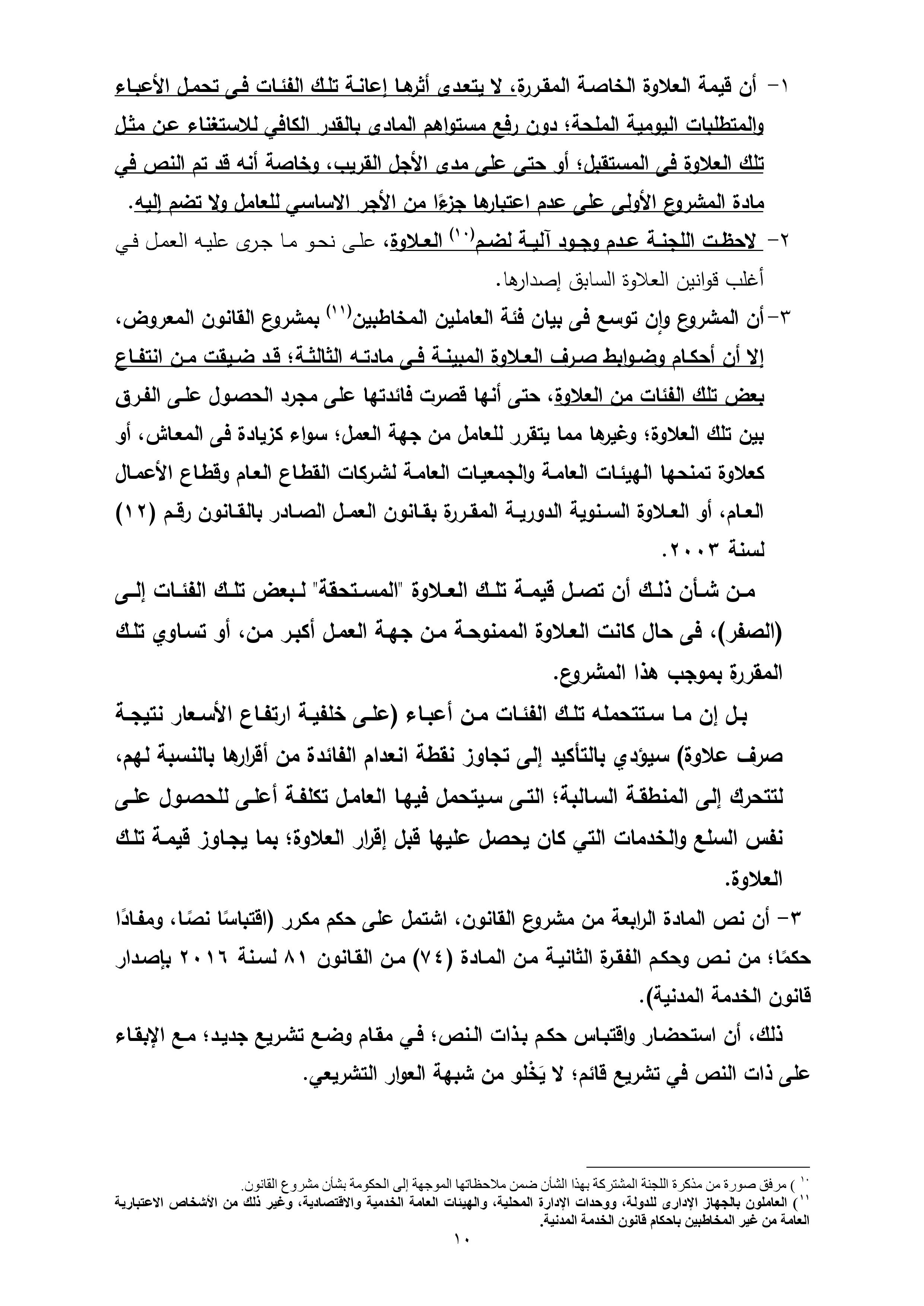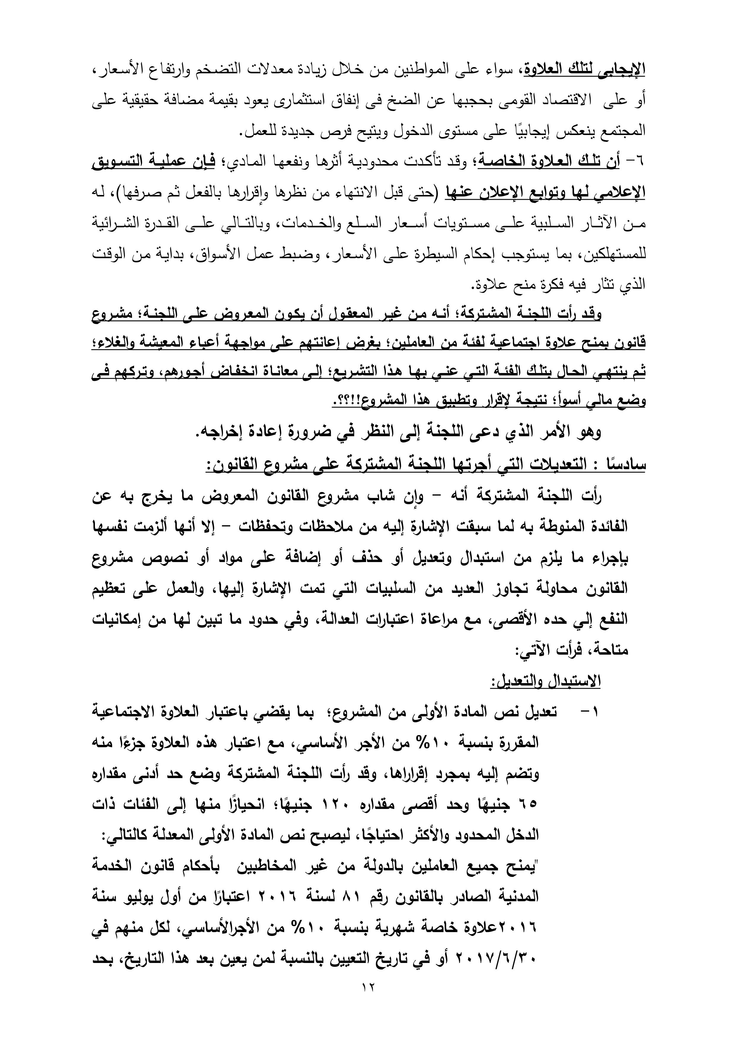 تنشر “وكالة أنباء البترول والطاقة”، نص تقرير لجنة القوى العاملة بمجلس النواب، بشأن مشروع قانون العلاوة الخاصة للعاملين بالدولة من غير المخاطبين بأحكام قانون الخدمة المدنية رقم 81 لسنة 2016، والذى سيعرض على الجلسة العامة لمجلس النواب الأسبوع الجارى لمناقشته وإقراره.