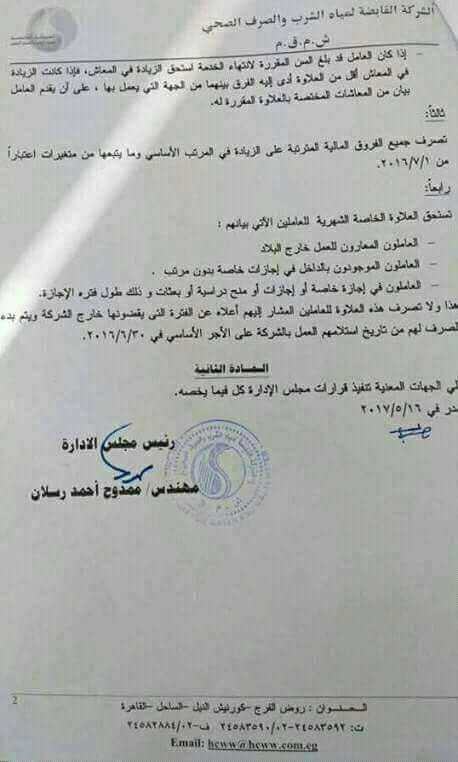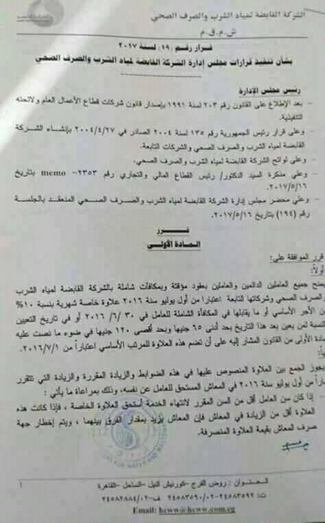 ننشر ضوابط صرف العلاوة للعاملين بمياة الشرب والصرف الصحي وتـأثيرها على البدلات والحوافز