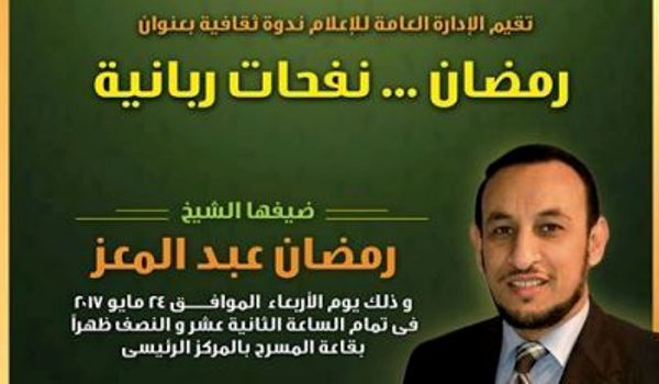 تحت رعاية المهندس كارم محمود، رئيس مجلس الإدارة والعضو المنتدب، تقيم الإدارة العامة للإعلام ندوة ثقافية بعنوان، رمضان … نفحات ربانية ، ضيفها الشيخ رمضان عبد المعز و ذلك اليوم الأربعاء ٢٤ مايو ٢٠١٧