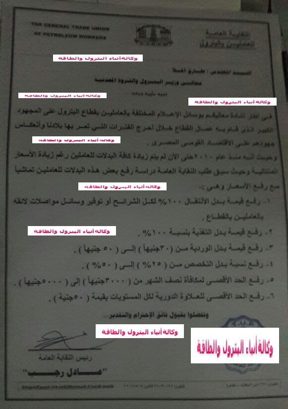 فى استجابة سريعه لمطالب العاملين، من النقابة العامة للعاملين بالبترول برئاسة السيد عادل رجب، أعدت النقابة العامة مذكرة للعرض على المهندس طارق الملا ، تعرض فيها فيها زيادة منحة نصف الشهر والبدلات والعلاوة الدورية، وجاء نص الخطاب كالأتى:
