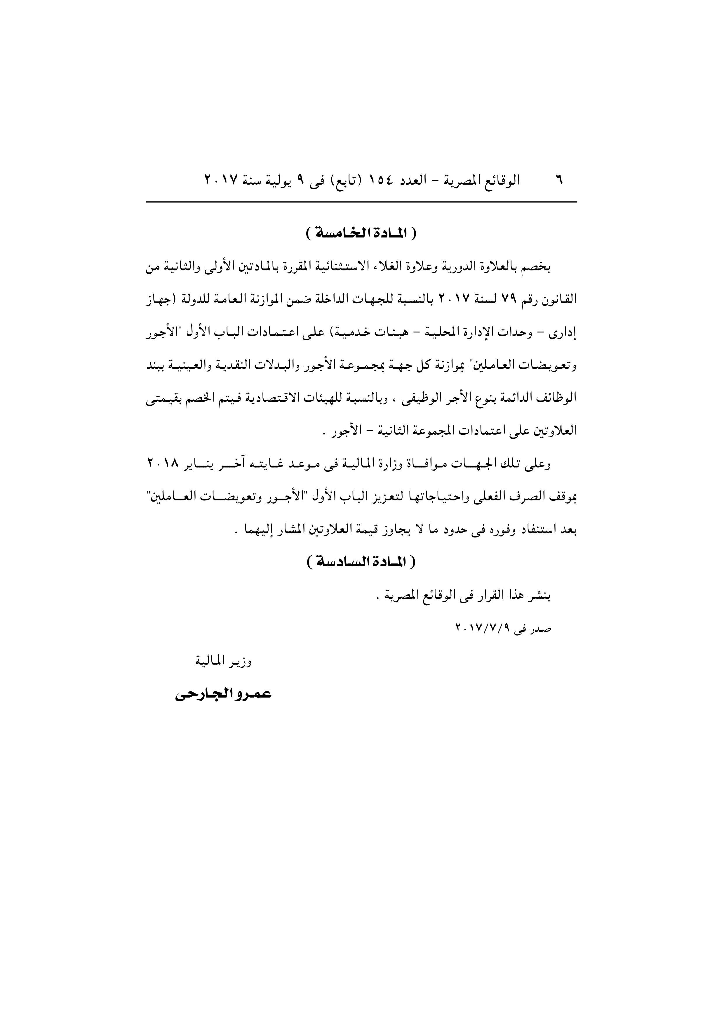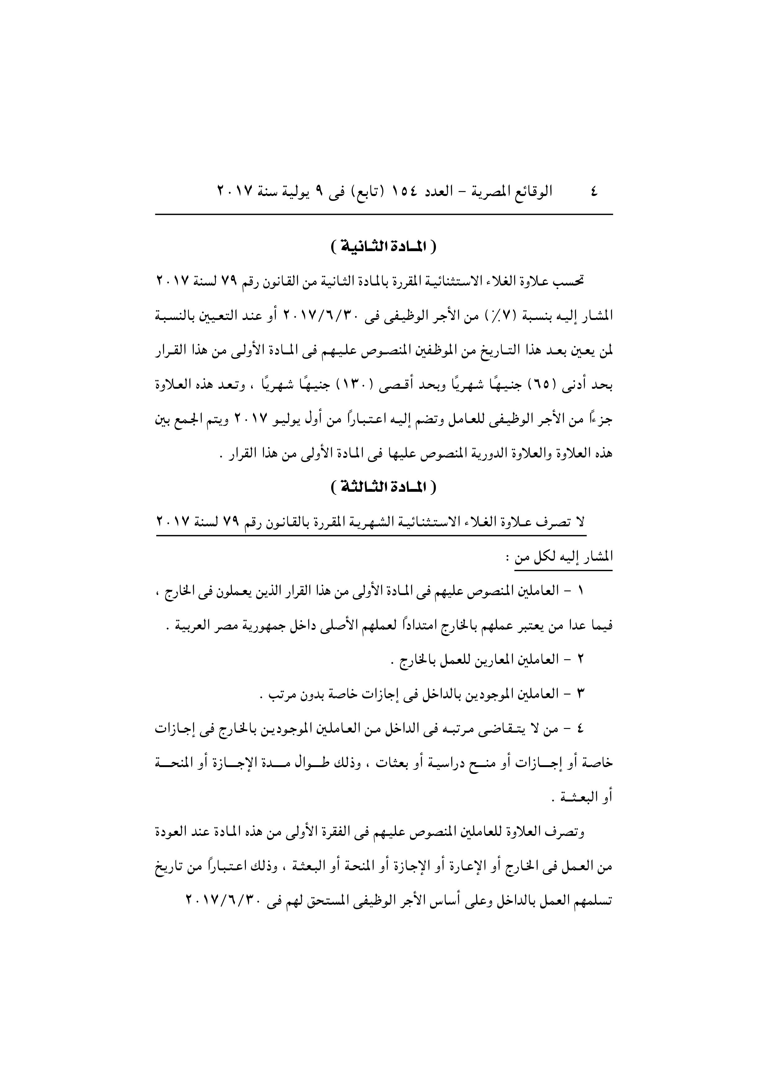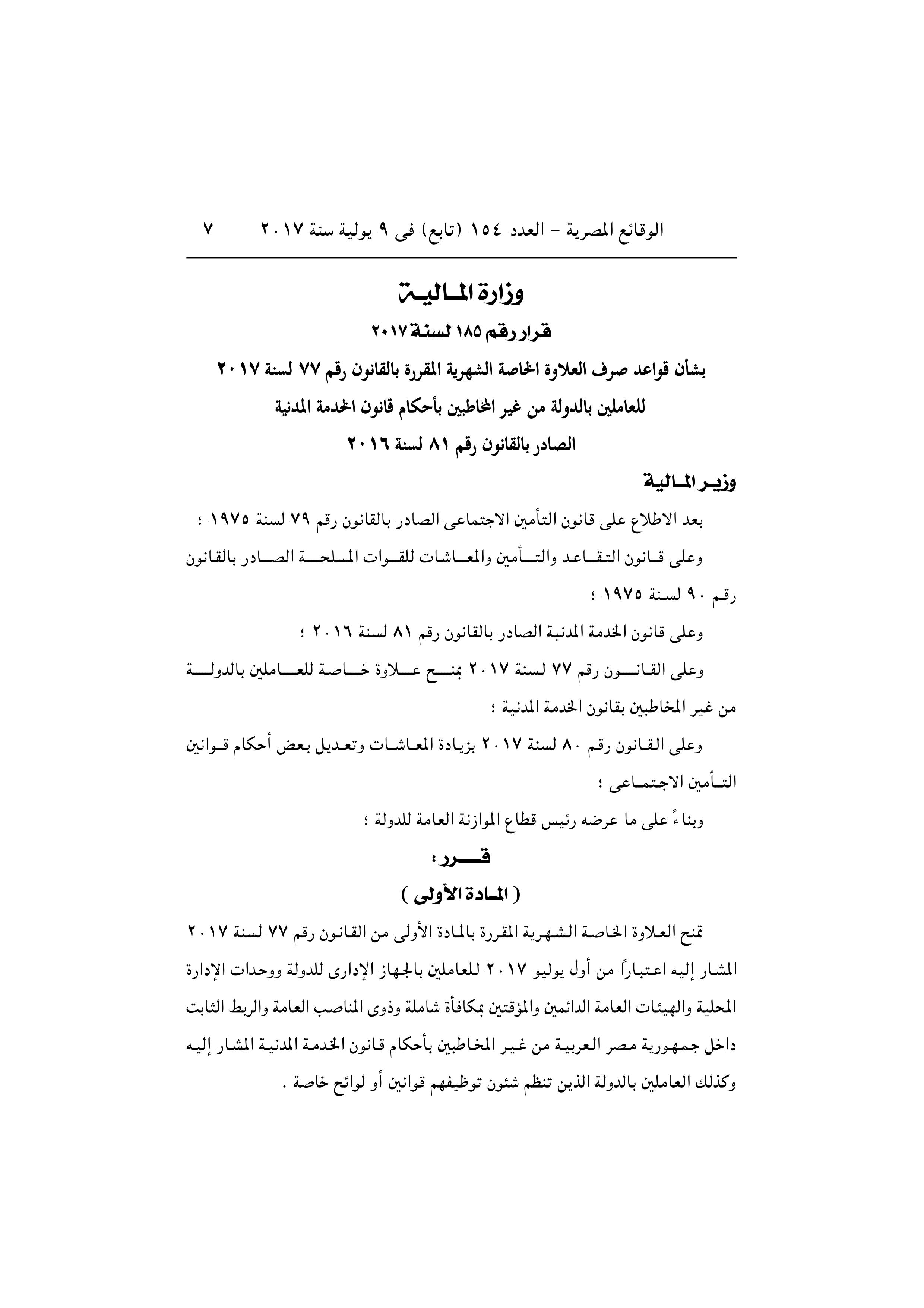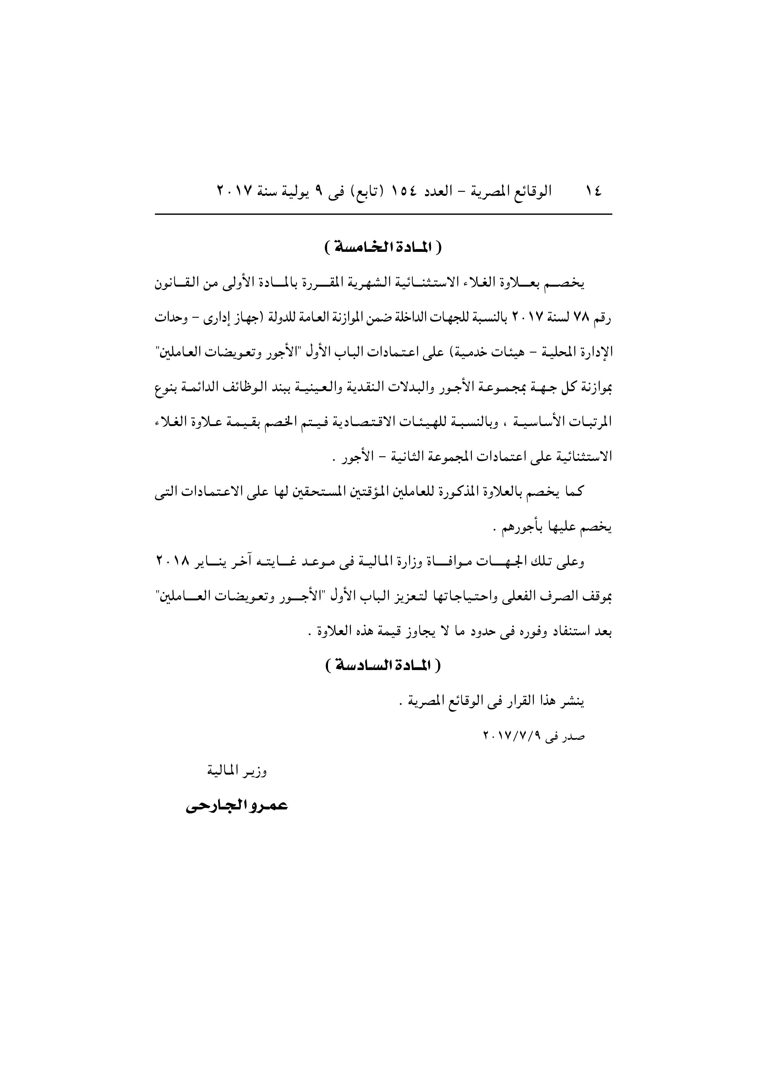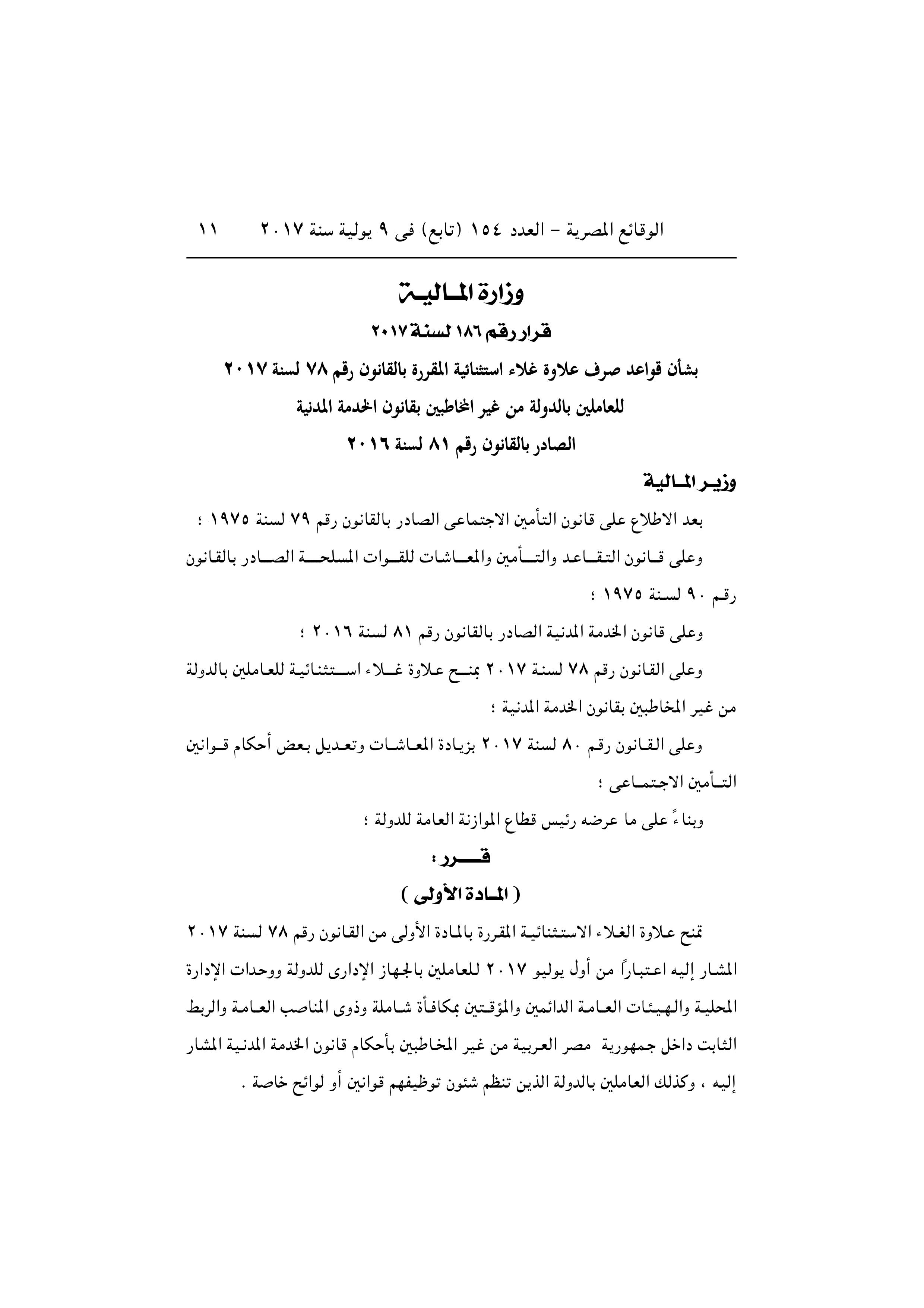 نشرت الجريدة الرسمية منذ قليل ، قرار وزير المالية رقم 184 لسنة 2017 بشأن قواعد صرف العلاوة الاستثنائية المقررة بقانون رقم 79 لسنة 2017 للمخاطبين بأحكام قانون الخدمة المدنية الصادر بقانون رقم 81 لسنة 2016 وقواعد صرف العلاوة الدورية.