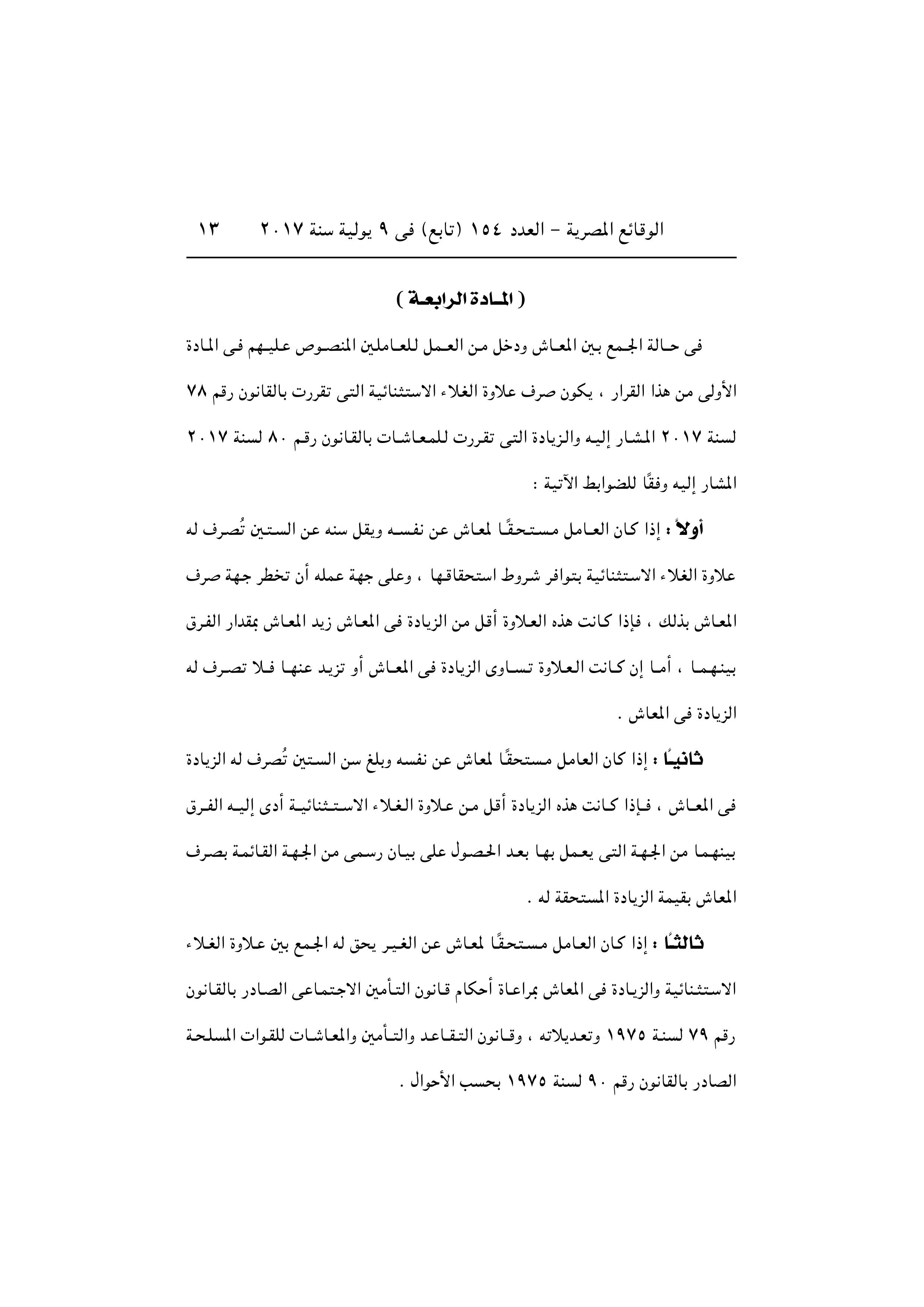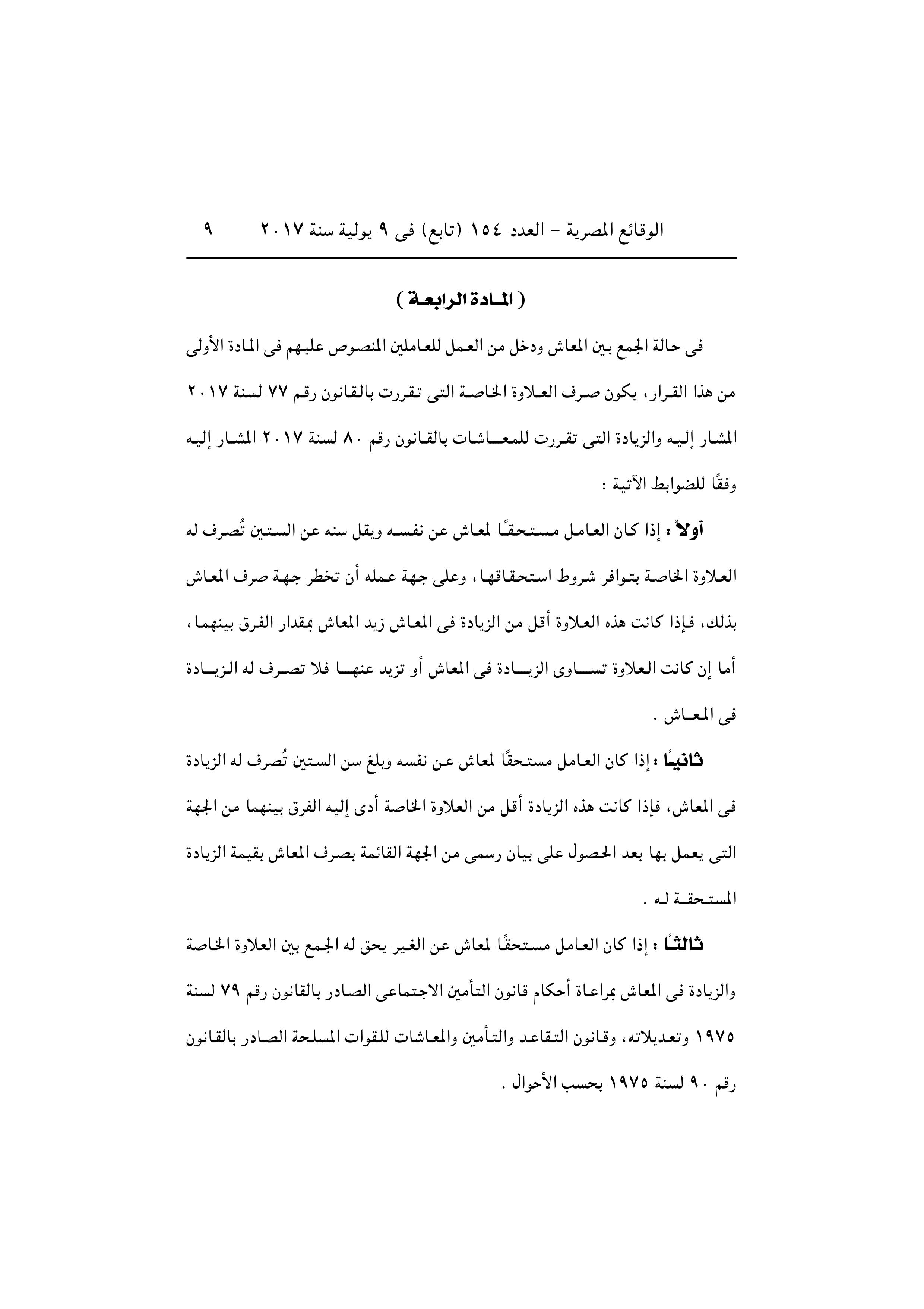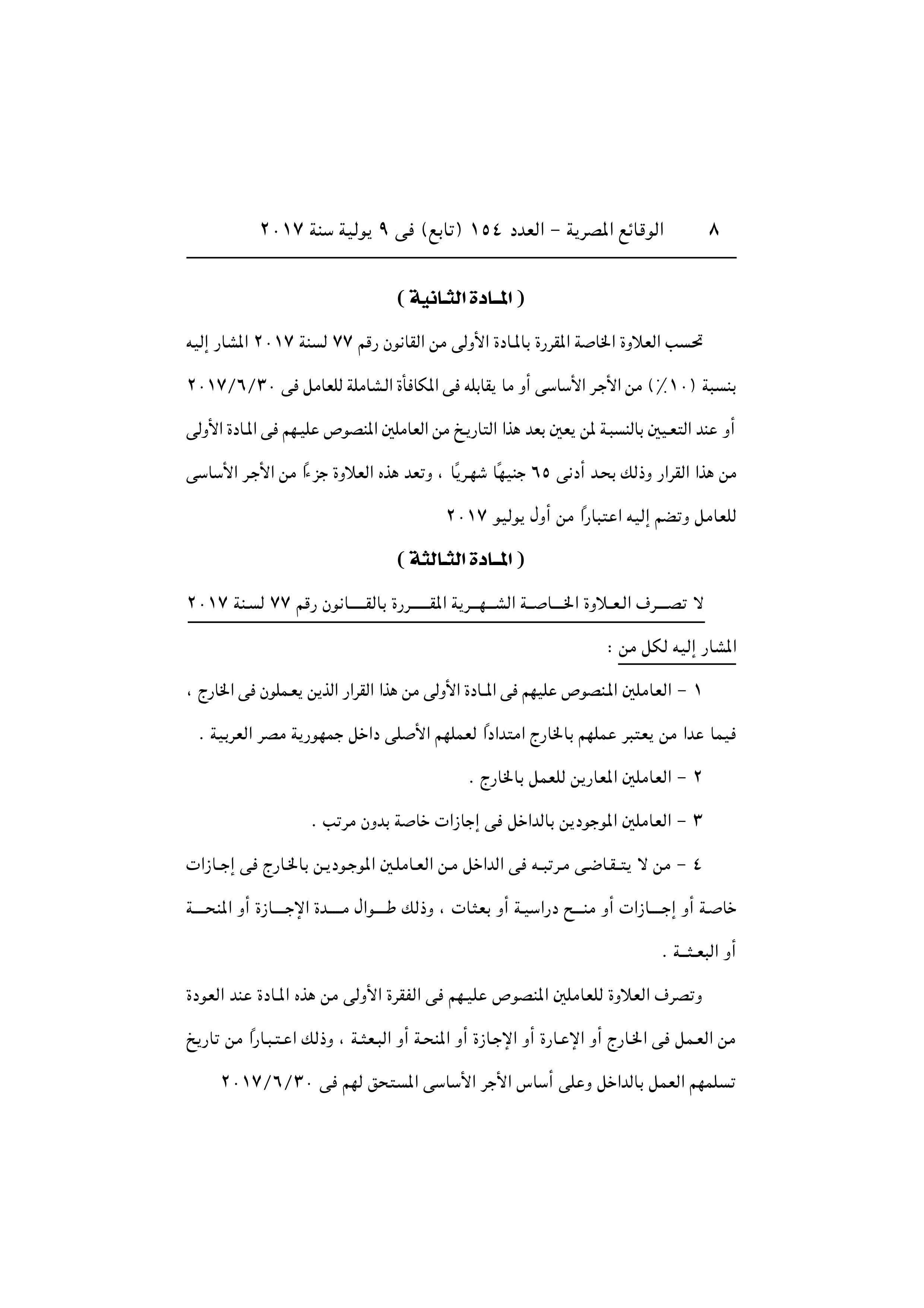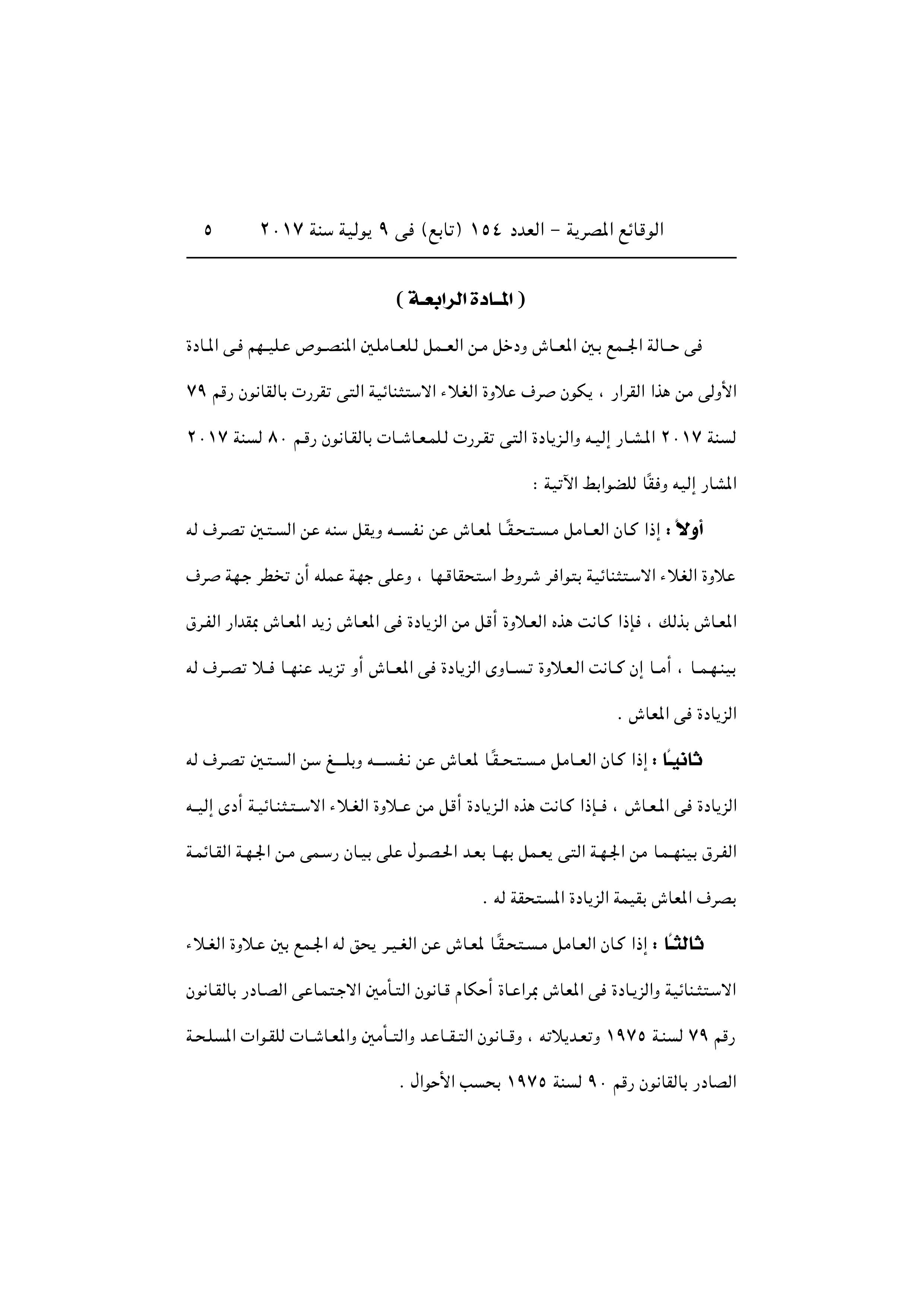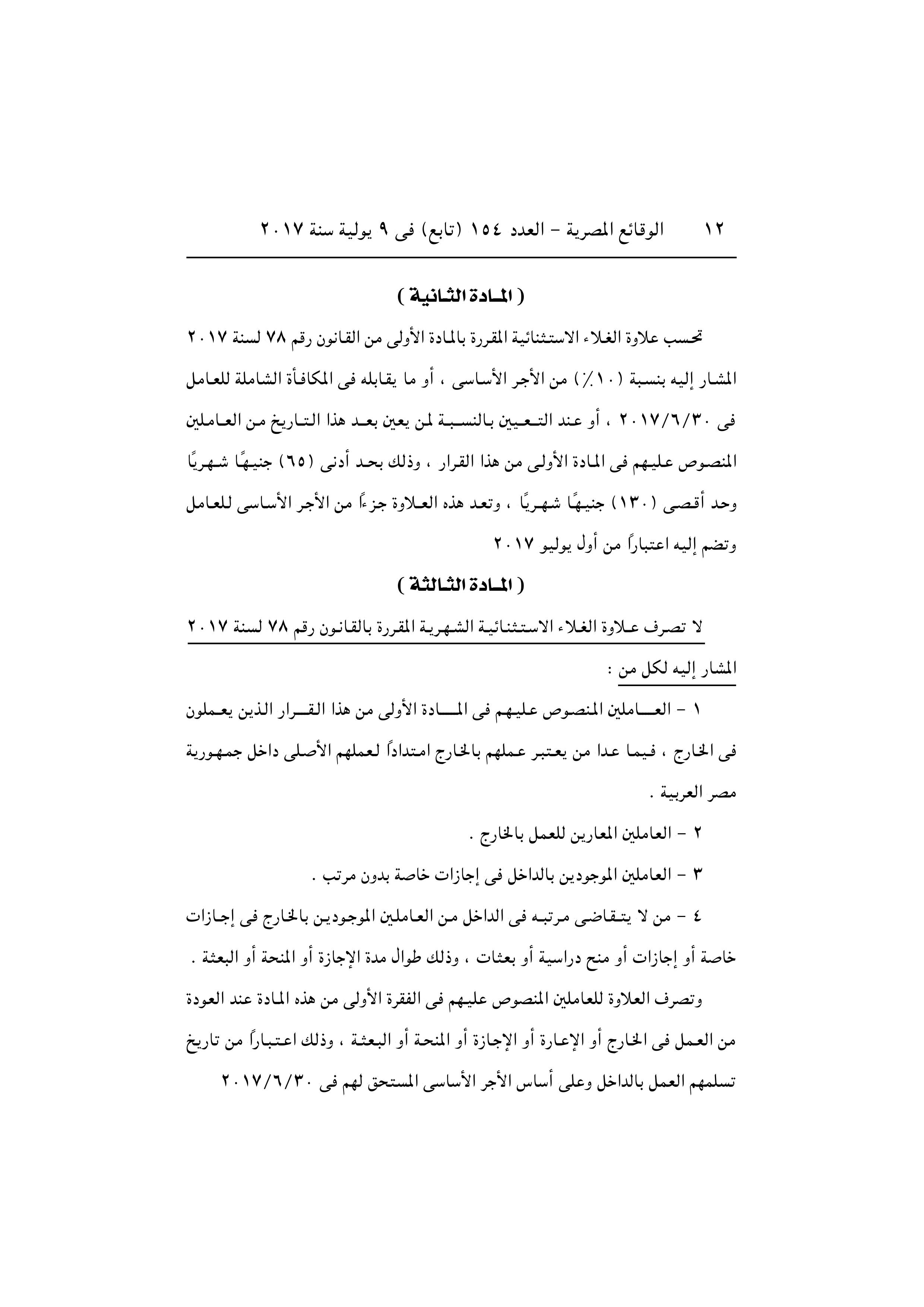 نشرت الجريدة الرسمية منذ قليل ، قرار وزير المالية رقم 184 لسنة 2017 بشأن قواعد صرف العلاوة الاستثنائية المقررة بقانون رقم 79 لسنة 2017 للمخاطبين بأحكام قانون الخدمة المدنية الصادر بقانون رقم 81 لسنة 2016 وقواعد صرف العلاوة الدورية.